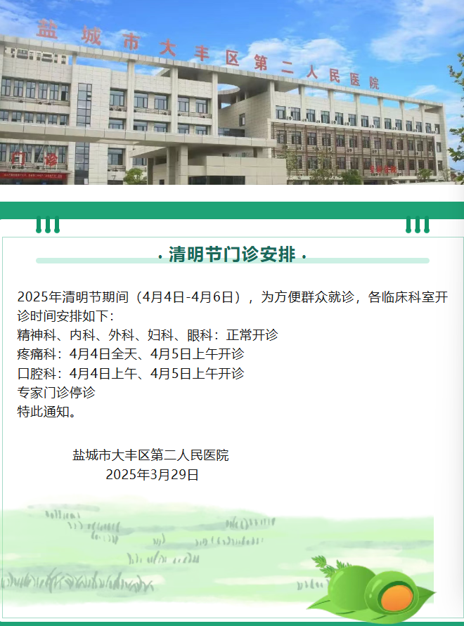 盐城市大丰区第二人民医院2025年度清明节门诊安排