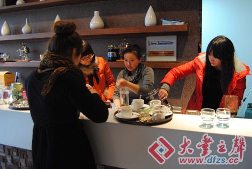 正能量咖啡馆总经理郑秀莲指导服务生为顾客调配咖啡、热饮。 摄影:大丰之声 老羊
