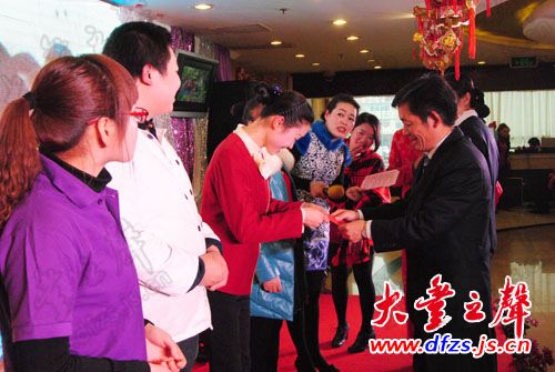 丰东大酒店领导为酒店组织的掼蛋比赛和联欢会上的获奖节目颁奖。