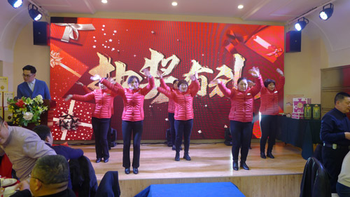 服务员们表演完舞蹈准备回座时,被大丰餐饮行业协会冯明建秘书长叫住。