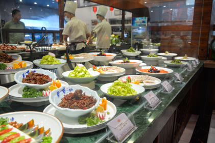 来宾欣赏花都福地酒店一楼的明档川菜。