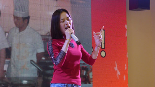 歌手和花都宴会餐饮管理有限公司的员工们互动,让联欢会达起高潮。