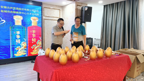 9月10日晚,盐城市合顺商贸有限公司“情满中秋 感恩共顺”高端客户联谊会在银海岸大酒店二楼古井事事顺大厅举行,来自全区的150多名客户欢聚一堂提前过中秋佳节,大家品古井事事顺酒,订货砸金蛋叙友情,度过愉快的夜晚。 联谊会于晚上7:30举行,安徽古井贡酒股份有限公司张经理致辞,介绍古井事事顺酒,欢迎广大客户光临,“江湖一杯酒,天下皆朋友,为人生贵人,品事事顺酒。”张经理在致辞中介绍到,“盐城市合顺商贸有限公司代理的古井贡酒在大丰迎来了第四个春秋,四年来公司和客户一起成长,秉承诚信、服务、创新的精神,今年与各乡镇联合发展,为振兴乡村经济助力,以赞助贫困户、成立大学生助学奖金、支持政府公益广告的宣传等为抓手,不断将企业文化做强做大。” 此次参加订货的主要是古井事事顺酒,由盐城市合顺商贸公司大丰总代理,主办方为回馈广大客户,推出最大感恩优惠活动,订货砸金蛋活动吸引了众多客户踊跃订货,现场砸金蛋活动搞了一轮又一轮,每个砸金蛋的客户都收获满满。 晚宴上,一些客户主动表演文娱节目,让晚会掀起一个个高潮。