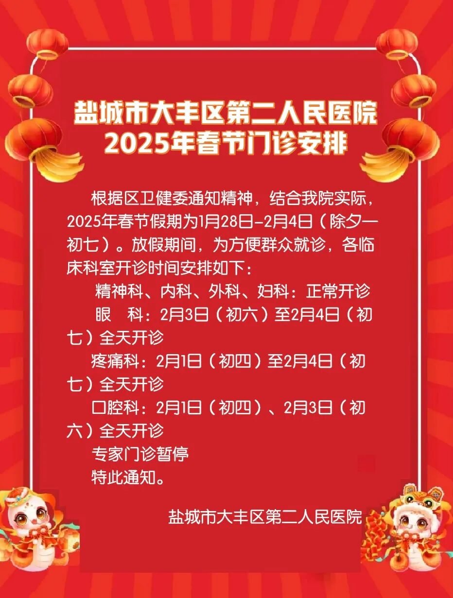 盐城市大丰区第二人民医院2025年春节门诊安排