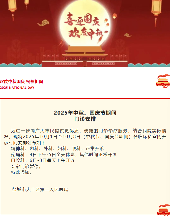 盐城市大丰区第二人民医院2025年中秋国庆节期间门诊安排